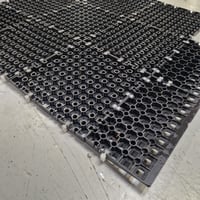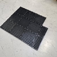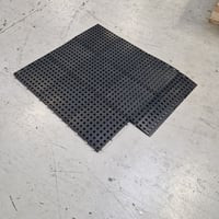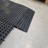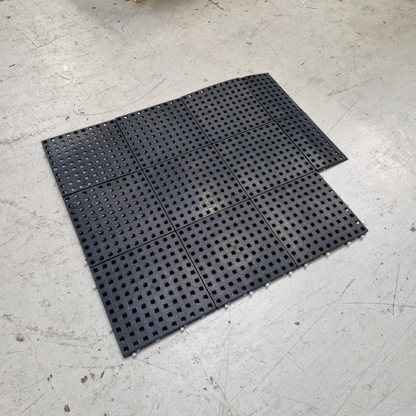 Komfort fliser i sort, lavet af genanvendelig plast. 250 x 250 x 18 mm. Over 100 m2. Med ramper og mulighed for kabelføring under gulvet.